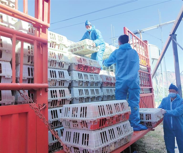9月28日,武都区柏林镇石桥子村的标准化蛋鸡养殖场农户正在搬运新增的5.04万羽鸡苗。近年来,柏林镇积极调整农业产业结构,因地制宜大力发展生态蛋鸡养殖业,通过“合作社+党支部+农户”的集体共同增收模式,推动蛋鸡养殖规模化、智能化、品牌化发展,建设年产鲜鸡蛋1000余吨的特色产业链,带动村集体经济全面提质增效,让更多农户在家门口稳定就业增收。陇南日报记者 李旭春 通迅员 李 坤 摄影报道