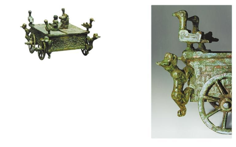 圆顶山墓地所出青铜器中,观赏性和研究价值最高,从而受世人青睐的当首推出土的一件车形器——蟠虺纹四轮车形青铜器。其通高8.8厘米,舆厢长11.7厘米,宽7.5厘米,高3厘米,轮径4厘米。四轮无辕,方舆有盖。舆厢呈盒形,盖由中间纵向启缝的两扇合成。舆上四角各安装1只立鸟,鸟足可以旋动。当4鸟方向同舆向一致时,厢盖即可开启;如果鸟向同舆向错位,厢盖即被锁住。装饰与实用相结合,寓机巧于观赏之中。盖扇对接处,一侧为蹲坐的熊钮,一侧为跪坐屈臂的人形钮(人首断佚,后经修增),人、熊相向。舆下装带轴的四轮,每轮辐条8根,车毂突出,軎辖俱全,虽经两千多年的水浸土蚀,至今仍可运行。舆身四侧及盖面,均饰细密蟠虺纹。此器的功用和性质是饶有兴味的问题。有学者主张这是一只妇女放置首饰、化妆品的盒子,并据此推论墓主为女性;有学者认为这是辆微型挽车,用作明器。笔者赞同认为,因为结构如此复杂、附饰如此张扬的首饰盒,是不便于实用的。所谓挽车,指先秦王公贵族丧事中运送灵柩之车,须由死者的亲属、臣僚、挚友等生前关系密切的人执绋牵挽而行,不用马驾,故不设辕衡之类车件。因无辕衡驾驭马身以保持舆厢平衡,故须改两轮为四轮。因舆中置放灵柩,故须设盖并附以盛饰,以示华贵。此器同山西闻喜县西周晋墓所出“刖人守囿”六轮青铜挽车形制、装饰风格非常相似,规格也接近,二者当存在源流关系。