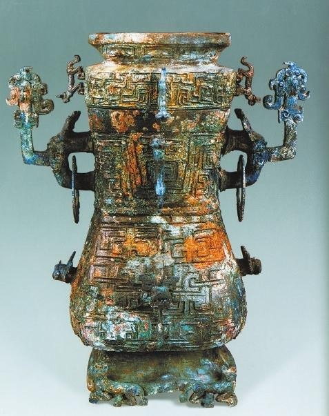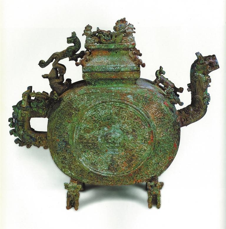 蟠虺纹扁圆青铜盉:通高32厘米,长35厘米,宽11厘米。长方形覆盘式高盖,圈顶式捉手,深子口,圆唇。盉身扁体,略呈椭圆形,圜底稍平,下支蹲坐熊头顶行虎的4足。盉腹一侧中部弯出兽流,兽头立双角,巨嘴圆张为流口,嘴两侧向外弯出如角的獠牙,兽腹与足爪外向。与流相对的盉腹另一侧为兽形鋬,兽腹与足爪同样外向,兽首耸角,巨口,同样有上弯的角状獠牙,鋬上部饰一仰身坐熊,双掌前举。盖顶圈内中央饰一冠齿硕大的卧鸟,圆目长喙;四角饰与卧鸟同型的4只小鸟,鸟首皆外向。盖沿四角斜棱上各饰1只向上爬行的小虎,而在与鋬靠近的一侧,饰1只前体附盖后体悬空的大虎,耸耳回首,长尾上卷,两后足恰与鋬上仰坐之熊前举的双掌相嵌衔,构成控制器盖开合的旋钮,而虎体则成为联结盖与錾的活链。设计构思之巧妙,动物造型之生动,铸作工艺之精细,令人叹为观止。盉肩部四圆角处各饰1只行虎,虎首外向,与盖棱之4行虎相对应。有流一侧肩部正中则饰一形体更大的回首虎,以填补空隙,减少因另一侧熊虎活链的复杂结构而造成的不平衡。盉腹两面正中心各饰一对脐状圆突,以圆突为中心形成内外两个装饰区域,以数周凸弦纹为界,域内饰细密蟠虺纹。全器附饰各类动物共计30只。