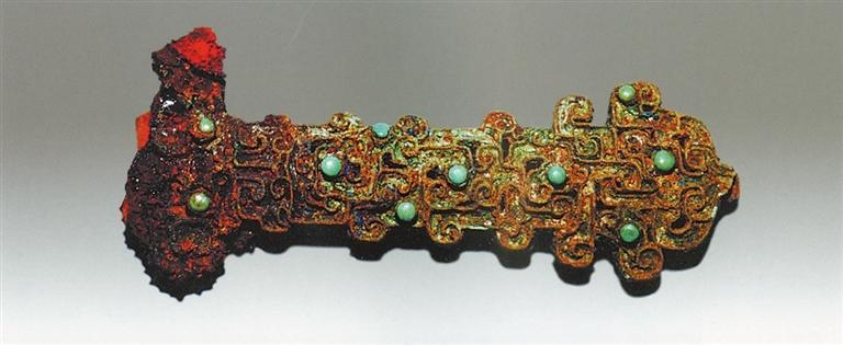 蟠虺纹镶绿松石青铜剑柄为其中一枚,长10厘米,首宽4厘米。镂雕蟠虺纹,纹路清晰遒劲。两面各均匀镶布9枚绿松石珠,翠色柔和,光泽晶莹。茎两侧出6组突齿,乃蟠虺纹样的自然伸展,和谐有致。圆顶山秦墓铁剑之铜柄,和陕西陇县边家庄、凤翔八旗屯秦墓剑柄近似,但镂纹更加繁丽,时代似较边家庄所出为晚而更接近八旗屯所出。宝鸡益门村春秋秦墓所出3件金柄铁剑的剑柄,亦镂空蟠虺纹,亦镶嵌绿松石,应是圆顶山秦式剑柄的进一步发展。