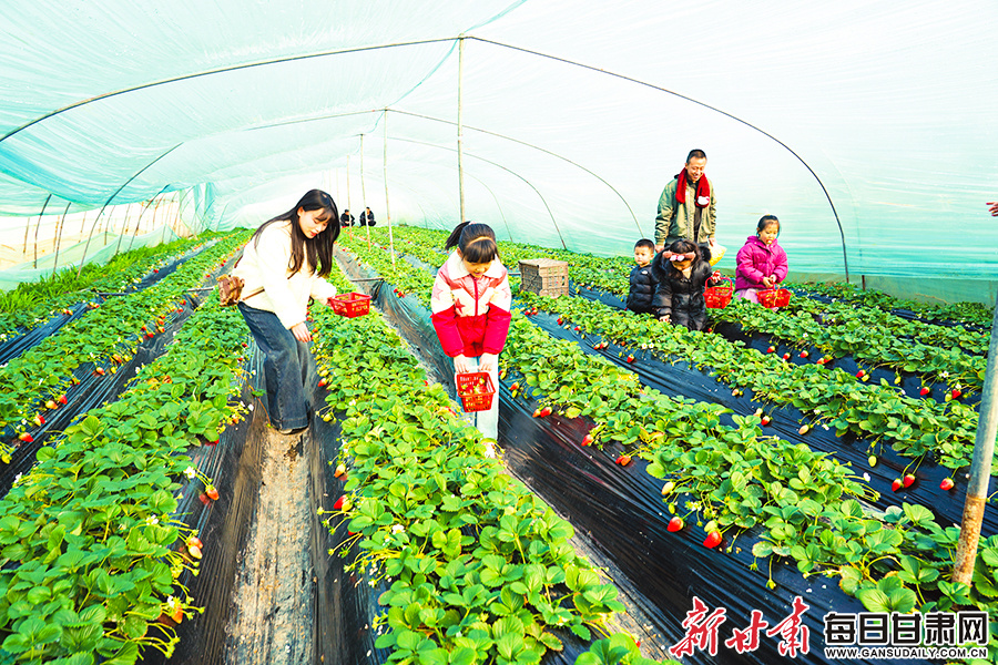 春节临近,西和县西峪镇大山草莓园种植大棚内,鲜红饱满的草莓挂满枝头,不少游客前来采摘尝鲜。