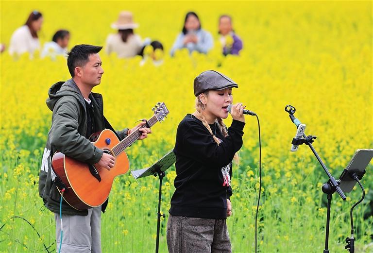 3月22日,游客在武都区角弓镇硝坝子村油菜花田里游玩。
